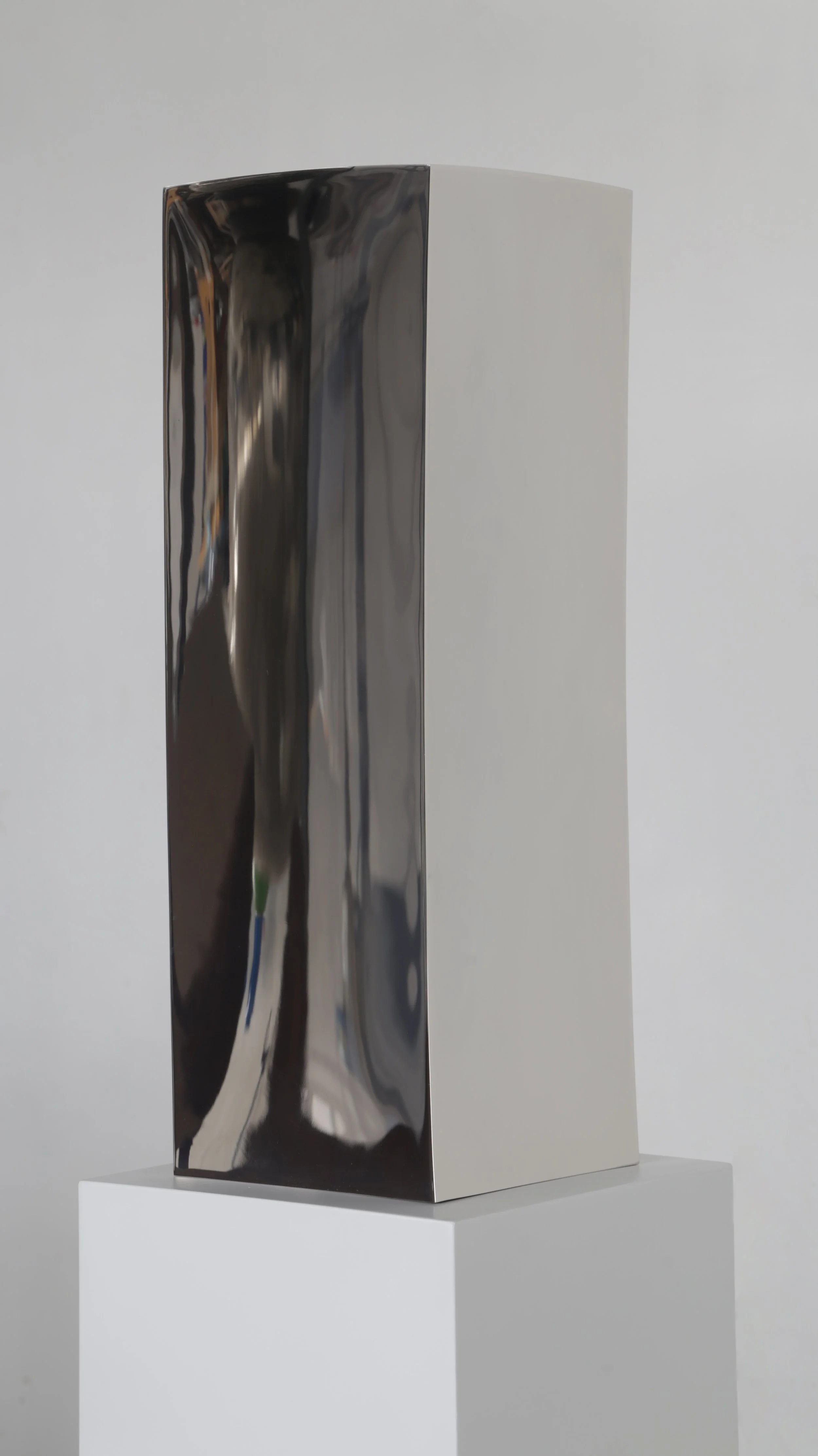 “The sculpture Plane to See seeks to play with traditional ideas of 3D geometry. Plane to See retains the vertices of a regular cuboid but uses parabolic lenses in lieu of flat planes. The curved surfaces join to form an elongated lenticular box that differs from the canonical composition of a flat box. The light reflected on the polished surfaces offers the viewer a deformed reflection of the environment.”