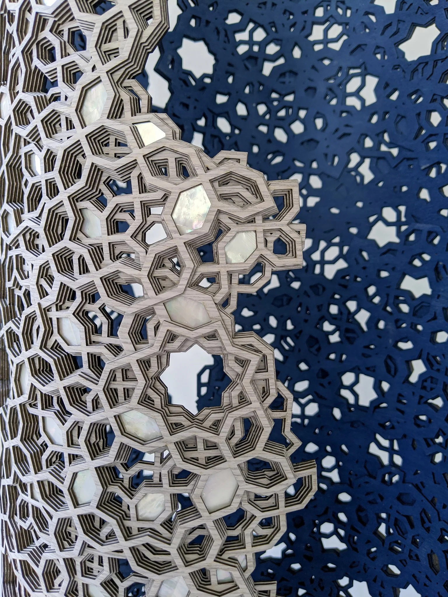The eight-point star is one of the earliest geometric pattern design elements dating back to the 9th century. I felt drawn to the beautiful simplicity of this motif and the possibilities of creating a visually intricate piece referencing traditional wooden and mother of pearl inlay work in an unexpected and contemporary way."