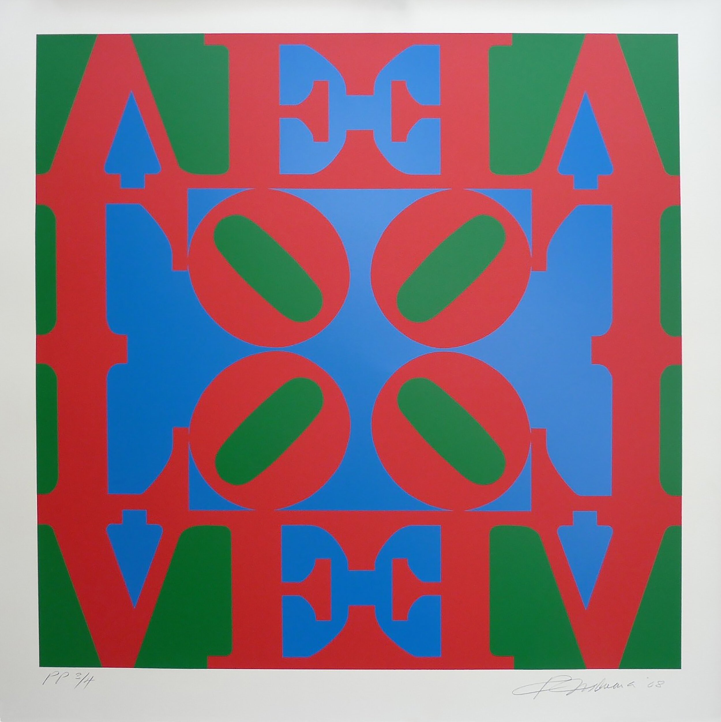 Indiana’s first “walls” were “love walls”, and they were first exhibited in 1966 at New York’s Stable Gallery. Love was comprised of four paintings or panels. Each panel contained a painting of his iconic LOVE (with the LO on top, O tilted, and the VE on the bottom). Each panel was the exact same size and shape – all were square. The four panels were placed together to make a larger square. As each panel was rotated, each letter was meant to mirror itself. Some of his Love Wall paintings were made into prints. It was not unusual for Indiana to publish a print in image of a painting that was placed in a museum or private collection. Indeed, most of Indiana’s published prints are based on those paintings that left his studio, not those that remained in his archives. “Over time, as ...paintings were bought by private collectors or public institutions, Indiana felt their loss keenly and felt that making a print of the departing canvas was a satisfying compensation. Thus developed a pattern throughout his career of producing prints of works that were leaving his hands.” (As stated by John Wilmerding in the Foreword of “The Essential Robert Indiana” by Krause, Wilmerding, (2013) at page 19.)