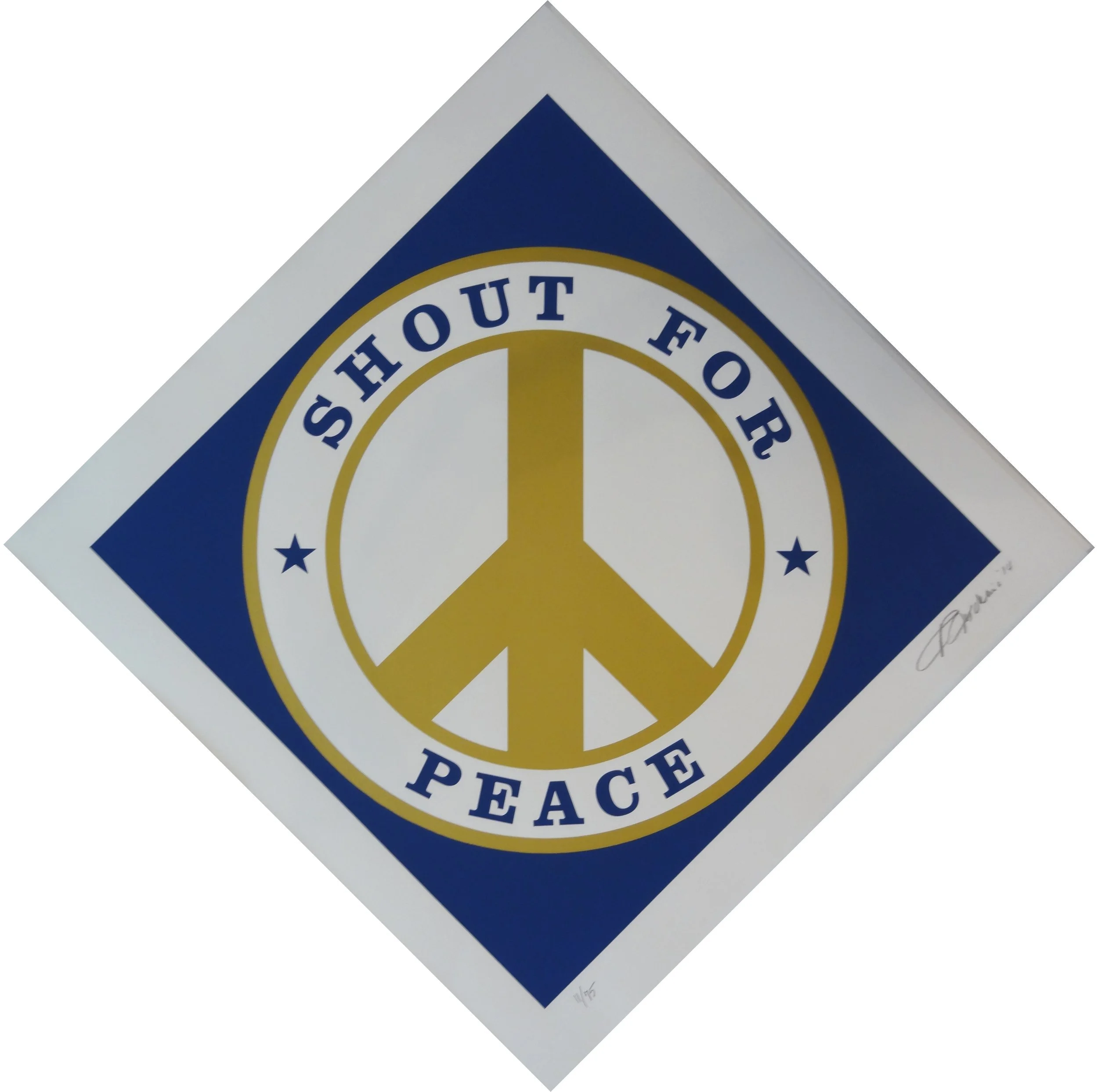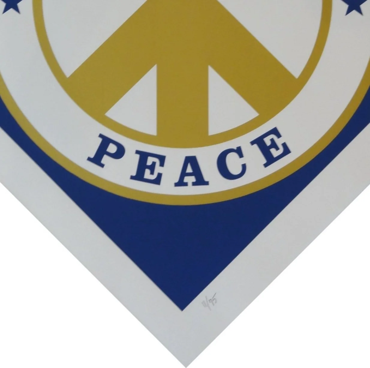 The diamond-shaped print features a bold circle bearing a block-lettered sentence calling for peace. Within the circle is the familiar forked peace sign in combinations of silver, gold, blue, and red. Indiana described his works featuring “peace” as “one long poem, with each… being a single stanza.”