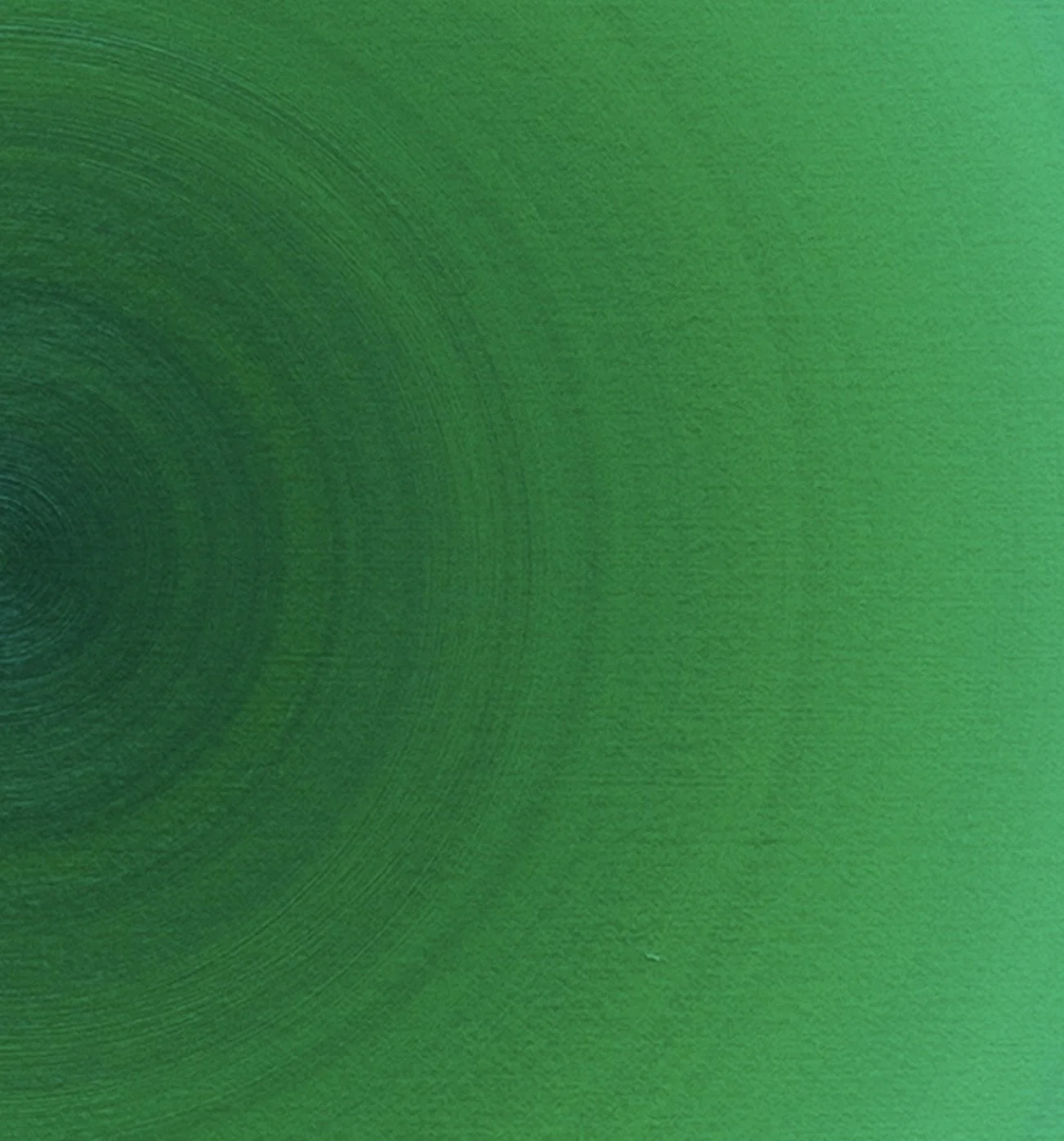 Loud guitars from the recording booth below vibrated old wooden floorboards which in turn rippled water in a bucket… I watched and imagined paintings of giant liquid speakers. I ordered two stretcher frames for the largest ‘widescreen’ canvasses that I could fit in and out of my studio and spent a week photographing ripples in the bucket. I started airbrushing a dark circular point with ripples emanating from the centre, but the format felt weak on the wide stretcher. I airbrushed for a couple of weeks and slowly evolved the composition to an oval format that worked with the dimensions of the canvas and simplified the ripples to a single glowing line. I had found my format for the show.