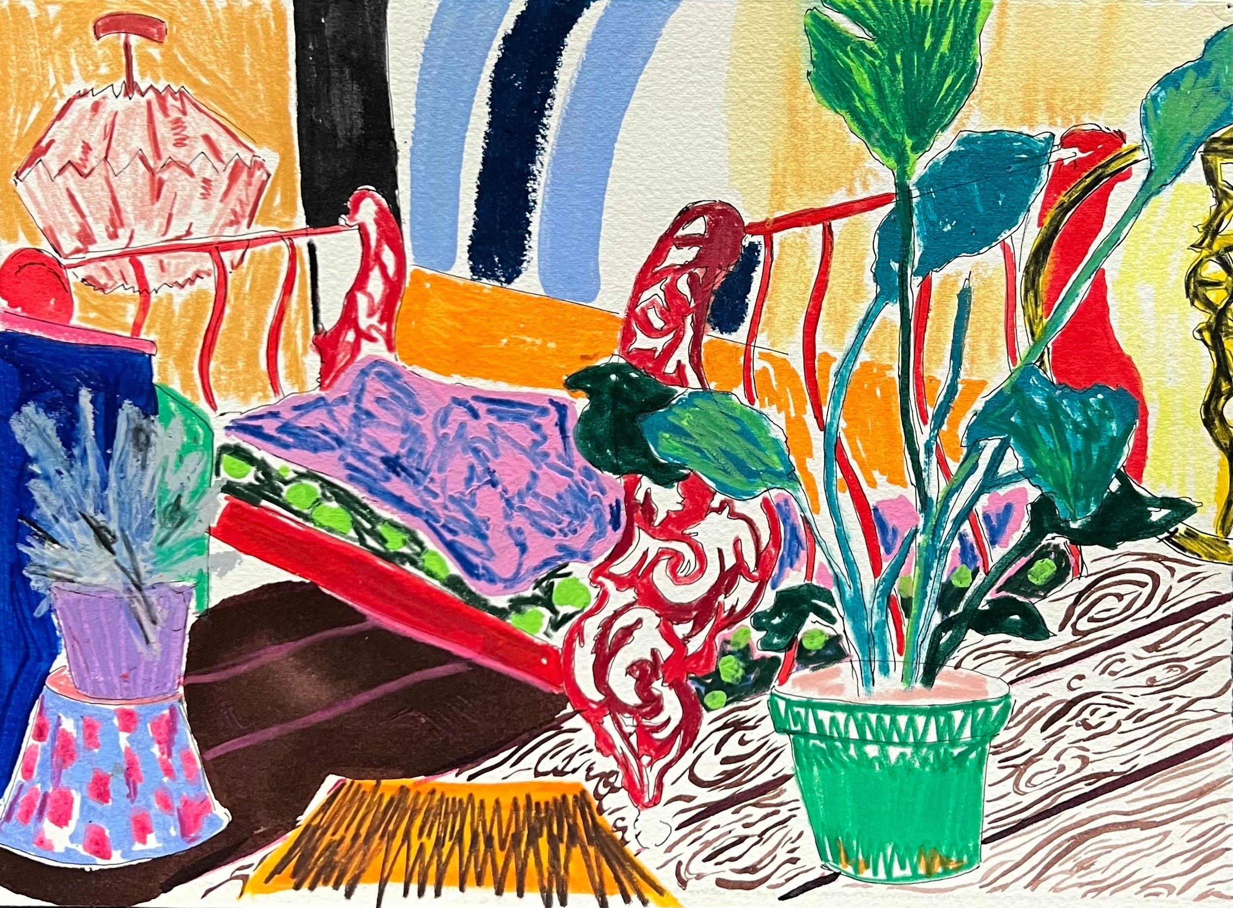 To Harris, a room is an oasis, and the things within bring the space to life. She reimagines the colorful dialogue that exists between room and furnishings, as interested in the negative space between objects as she is in the items themselves. Harris does not portray objects exactly as they are; rather, she employs a singularly distorted, ever-so-slightly off-kilter perspective to depict the subjective emotional experience they invoke.