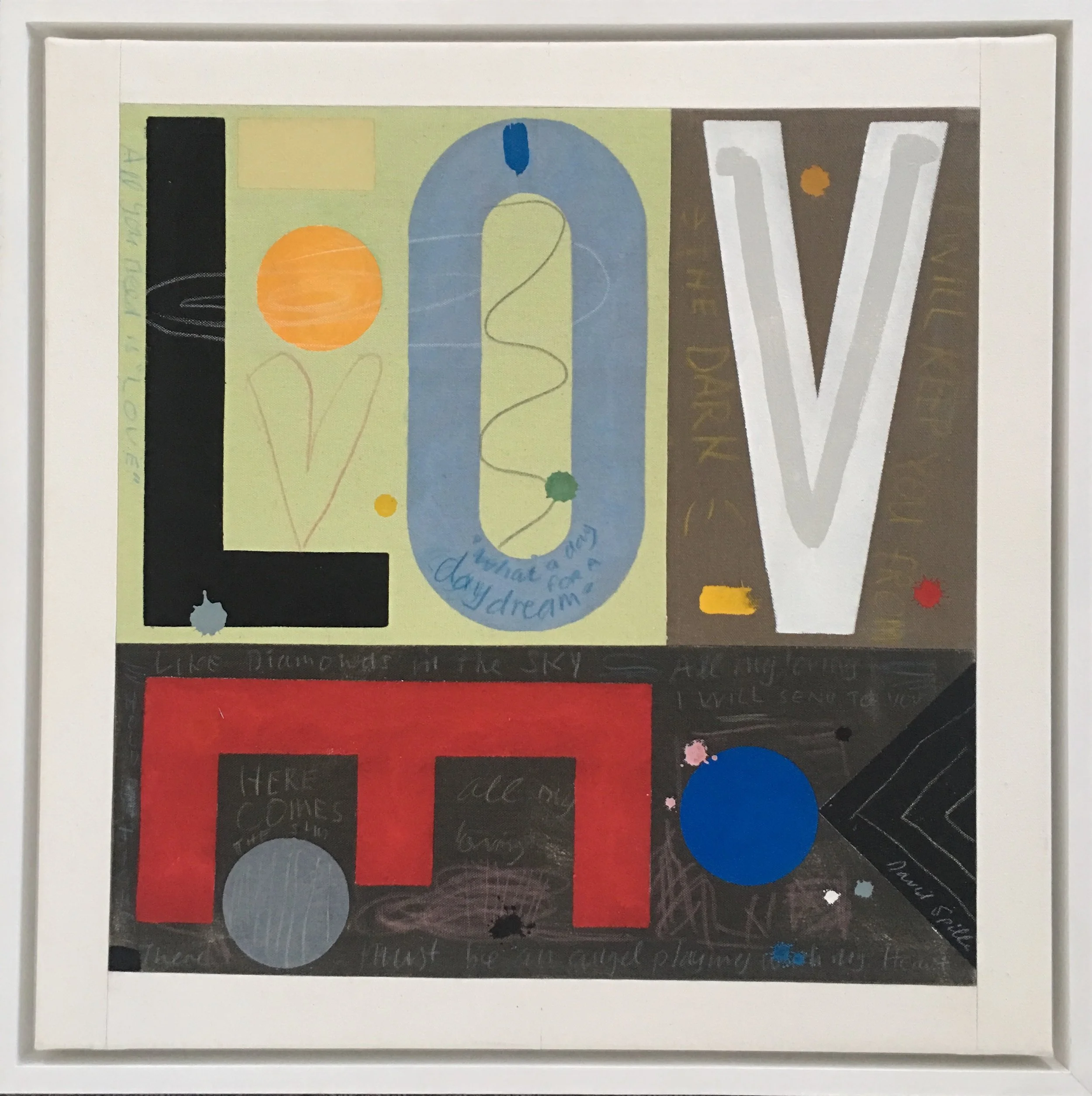 Spiller gave himself a mission to put one important word (LOVE) onto a small Canvas. He played around with the positioning possibilities of the 4 letters, slipping the E along the bottom. He loved the way the wall sign artists just added a letter underneath or around a corner, and how the brain still makes sense of a word even when the letters are not all aligned. He repeated the plaintive mantras… ‘I will keep you from the dark’ and ‘all you need is love’.