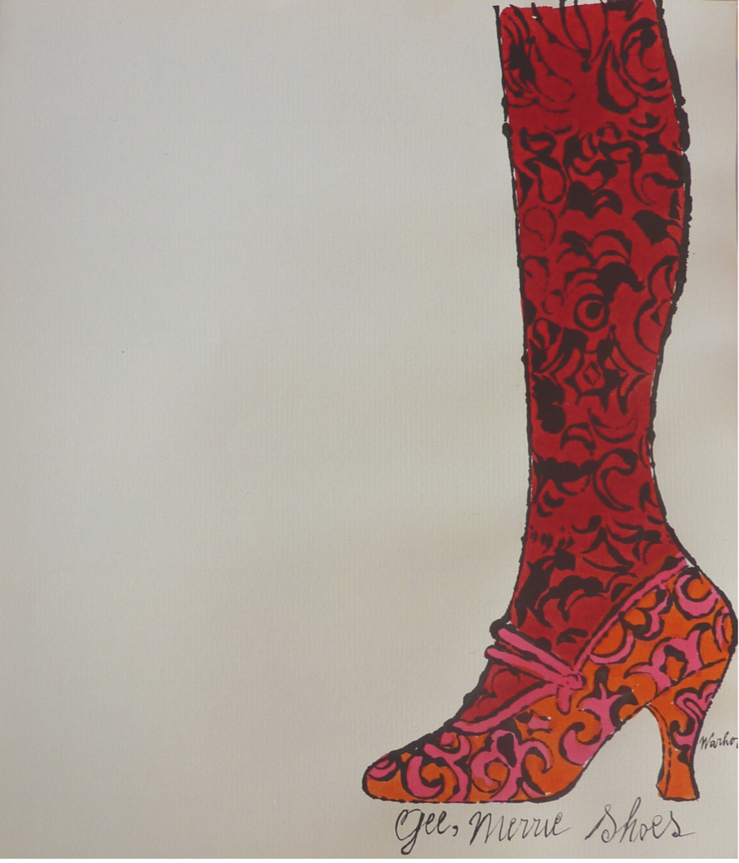 Shoes were a mainstay throughout Warhol’s art career; in 1949, on his second day introducing himself to publishers in New York, Warhol received his first assignment as a commercial illustrator- to illustrate shoes for New York’s Glamour Magazine. In the 1950s, Warhol was also responsible for revamping I. Miller’s advertising campaign, specifically through his blotted line drawings of shoes. He was so successful in this area that he eventually became known in the industry as “the shoe person.”