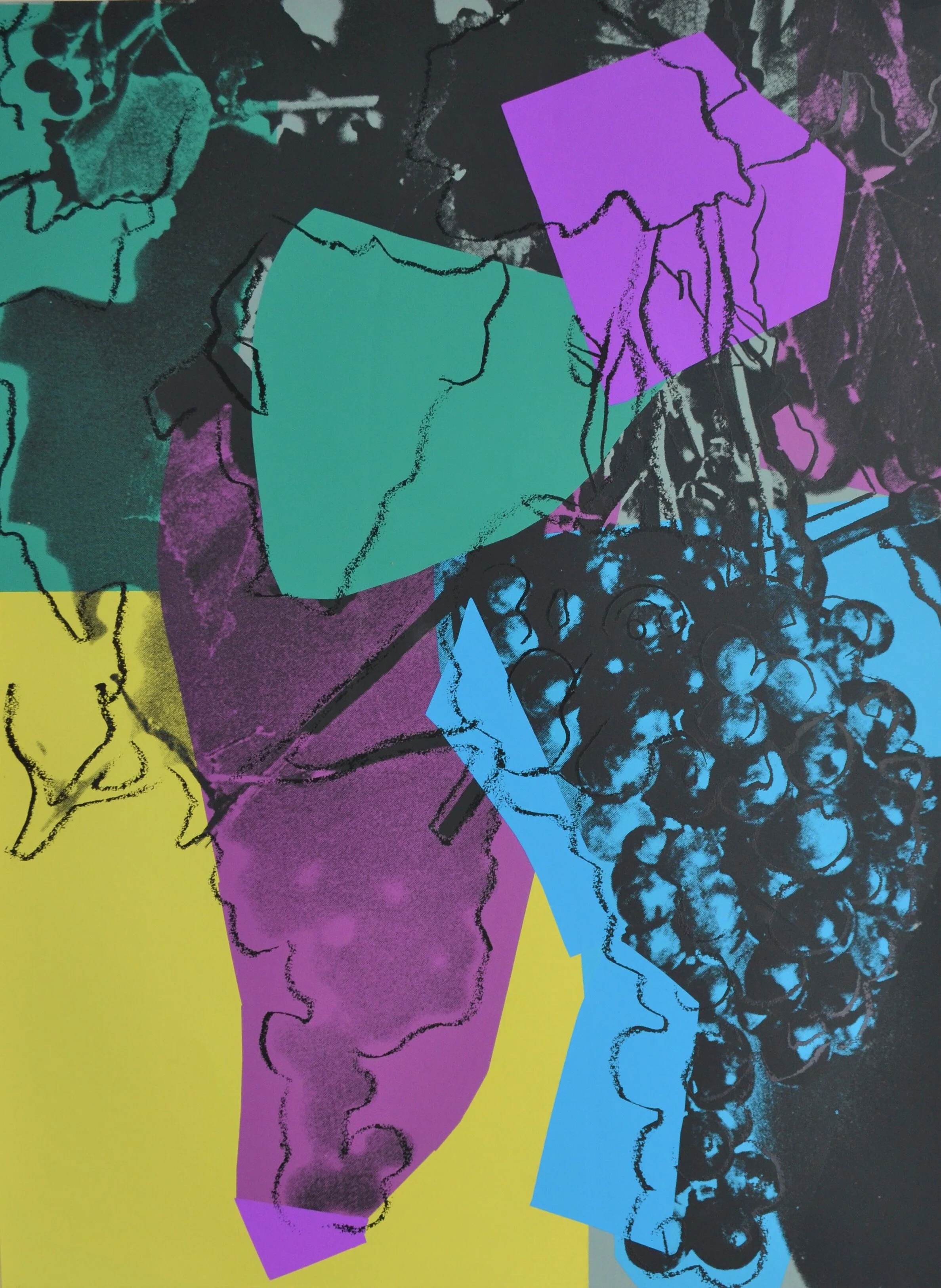 Works from the Grapes portfolio are examples of Warhol’s trials with and transformation of the traditional still life in the 1970s. These works invoke his experience as a photographer, draughtsman, and experimenter with screenprinting. The screenprinting technique allowed Warhol to layer many images, creating numerous color combinations from which he could choose.