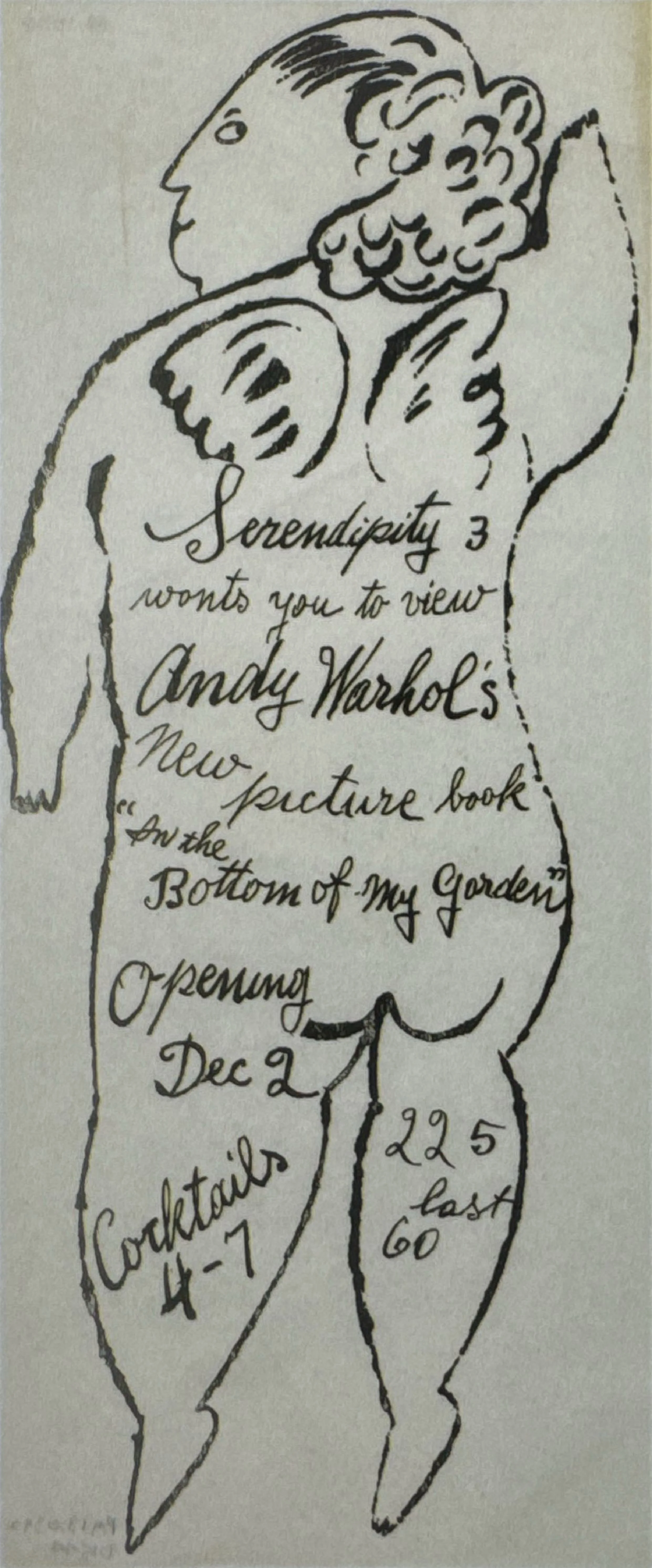 About this work: This rather unusually large study drawing from circa 1955-56 is believed to be a study for Warhol's 1956 book In the Bottom of My Garden. According to Charles Lisanby, the children (based on the putti familiar in art history [1]) were likely inspired by books Warhol saw in Amsterdam during their first trip abroad. Reading Andy Warhol, p.109. The first exhibition for In The Bottom of My Garden took place at New York's Serendipity 3 on December 2, 1956.
